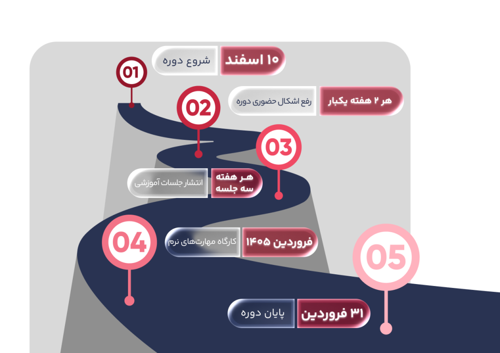 شروه دوره زمستانه از اوایل بهمن 1404 خواهد بود و جلسات آموزشی دوره هر هفته روزهای یکشنبه سهشنبه و پنجشنبه بهصورت ویدیویی از طریق پنل کاربری دانشجویان قابل دسترسی خواهند بود.